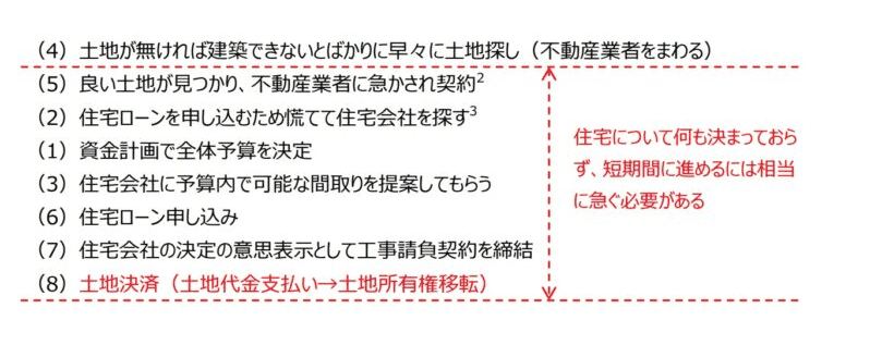 土地を買って新築するのであれば「まずは土地探しだ!」とばかりに、全体像が見えないまま(4)土地を探すため不動産業者をまわり、良い土地が見つかると不動産業者から「早く契約しないと他の人に取られちゃいますよ」と急かされ、(5)土地決定(購入) してしまうケースが多く見られます。