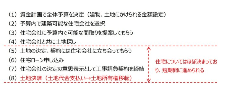 その後、(6)住宅ローン申込み →(7)住宅会社決定・工事請負契約 →(8)土地決済と進むため、住宅についてはほぼ決まった状態で、短期間かつ無理のないスケジュールで進めることができます。