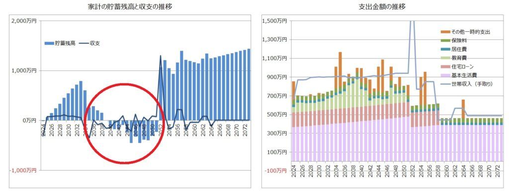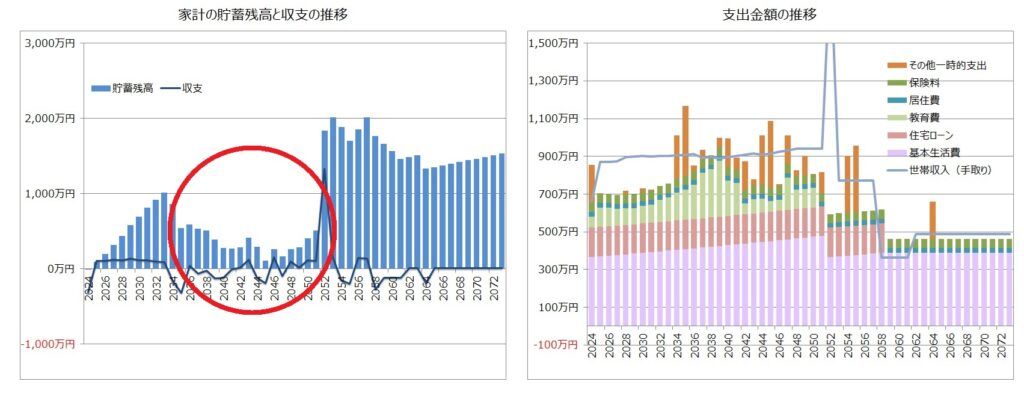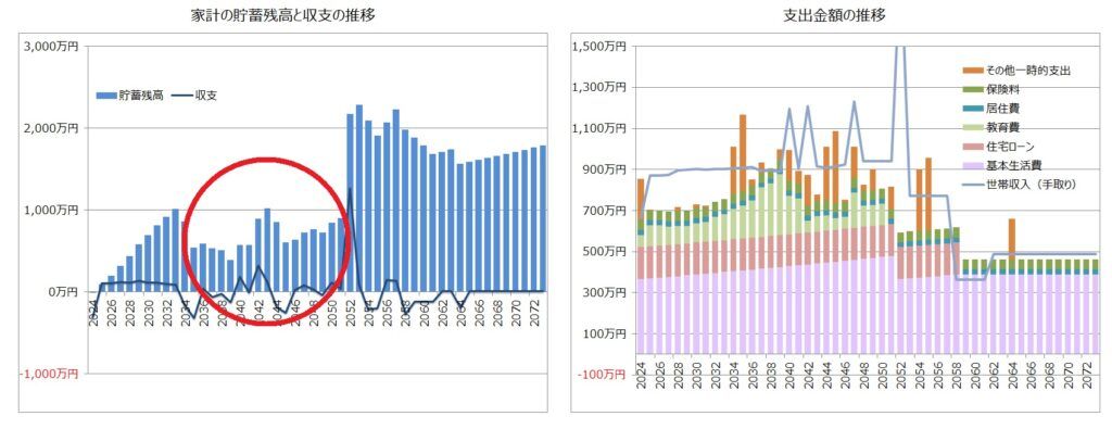 お子様の教育費が最もかかる時期に、貯蓄残高が大きく減少します。